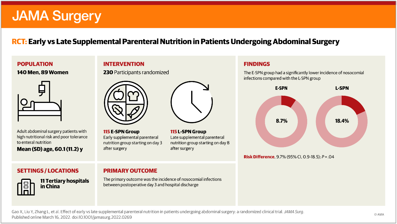 2022316日,开元娱乐-开元游戏-开元官网 附属金陵医院(东部战区总医院)普通外科王新颖教授团队在国际外科学顶级期刊JAMA Surgery(美国医学会杂志外科学,影响因子14.8分)杂志,在线发表题为《Effect of Early vs Late Supplemental Parenteral Nutrition in Patients Undergoing Abdominal Surgery: A Randomized Clinical Trial》一项重大临床研究成果。JAMA Surgery创刊于1920年,是医学四大期刊之一《JAMA》美国医学会杂志的系列成员。本研究是国际上第一个探讨腹部外科病人术后补充性肠外营养应用时机的多中心临床随机研究,也是中国学者在《JAMA Surgery》上发表的首篇外科营养领域的多中心临床研究。