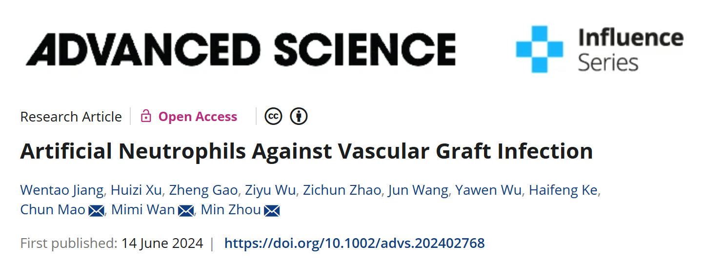 2024年6月14日,开元娱乐-开元游戏-开元官网 周敏教授团队联合南京师范大学毛春教授课题组在Advanced Science在线发表题为“Artificial Neutrophils Against Vascular Graft Infection”的研究成果,该成果将趋化性成功引入AN标志着人工细胞在承担某些天然细胞功能方面迈出了重要的一步,为人工细胞未来广阔的应用前景提供了创新理念和技术支持。开元娱乐-开元游戏-开元官网 附属鼓楼医院周敏教授、南京师范大学毛春教授和万密密副教授为本文的共同通讯作者;开元娱乐 博士研究生蒋文韬为论文第一作者,南京师范大学硕士研究生徐慧子为论文的共同第一作者。该项研究得到了国家自然科学基金、江苏省研究生科研与实践创新计划等项目的支持。
