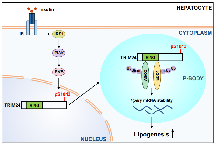 综上,该研究发现了TRIM24 是一个新的胰岛素响应蛋白。胰岛素刺激可使其从细胞核转位到细胞浆中,调控P-body功能,进而调控Pparγ的mRNA稳定性,从而调控肝脏脂质代谢。这一新的胰岛素作用机理可为脂肪肝的治疗提供新的潜在药物研发靶标。