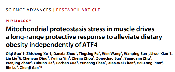 2022年7月27日,开元娱乐-开元游戏-开元官网 甘振继课题组在Science Advances上在线发表了题为“Mitochondrial proteostasis stress in muscle drives a long-range protective response to alleviate dietary obesity independently of ATF4”的最新研究成果。这项研究定义了骨骼肌线粒体UPRmt,揭示了UPRmt在哺乳动物体内的新生理功能和作用机制,阐明了骨骼肌线粒体UPRmt 通过ATF4非依赖的机制长距离调节肝脏和脂肪代谢决定整体代谢健康。开元娱乐-开元游戏-开元官网 博士研究生郭奇奇和徐志圣为本文的共同第一作者,甘振继教授为该篇论文的通讯作者。该研究得到了国家自然科学基金委、科技部、教育部、江苏省科技厅以及中央高校等基金的支持,同时也得到合作实验室的大力协助与支持。